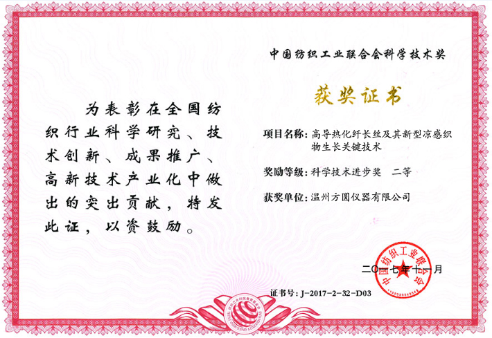 近日,在由中國紡織工業(yè)聯(lián)合會主辦、紡織之光科技教育基金會協(xié)辦的“紡織之光”2017年度中國紡織工業(yè)聯(lián)合會科技教育獎勵大會上,溫州方圓儀器有限公司參評的“紡織品水分蒸發(fā)檢驗儀器研究與開發(fā)”、“高導熱化纖長絲及其新型涼感織物生產(chǎn)關(guān)鍵技術(shù)”雙雙榮獲“科學技術(shù)進步獎二等獎”。